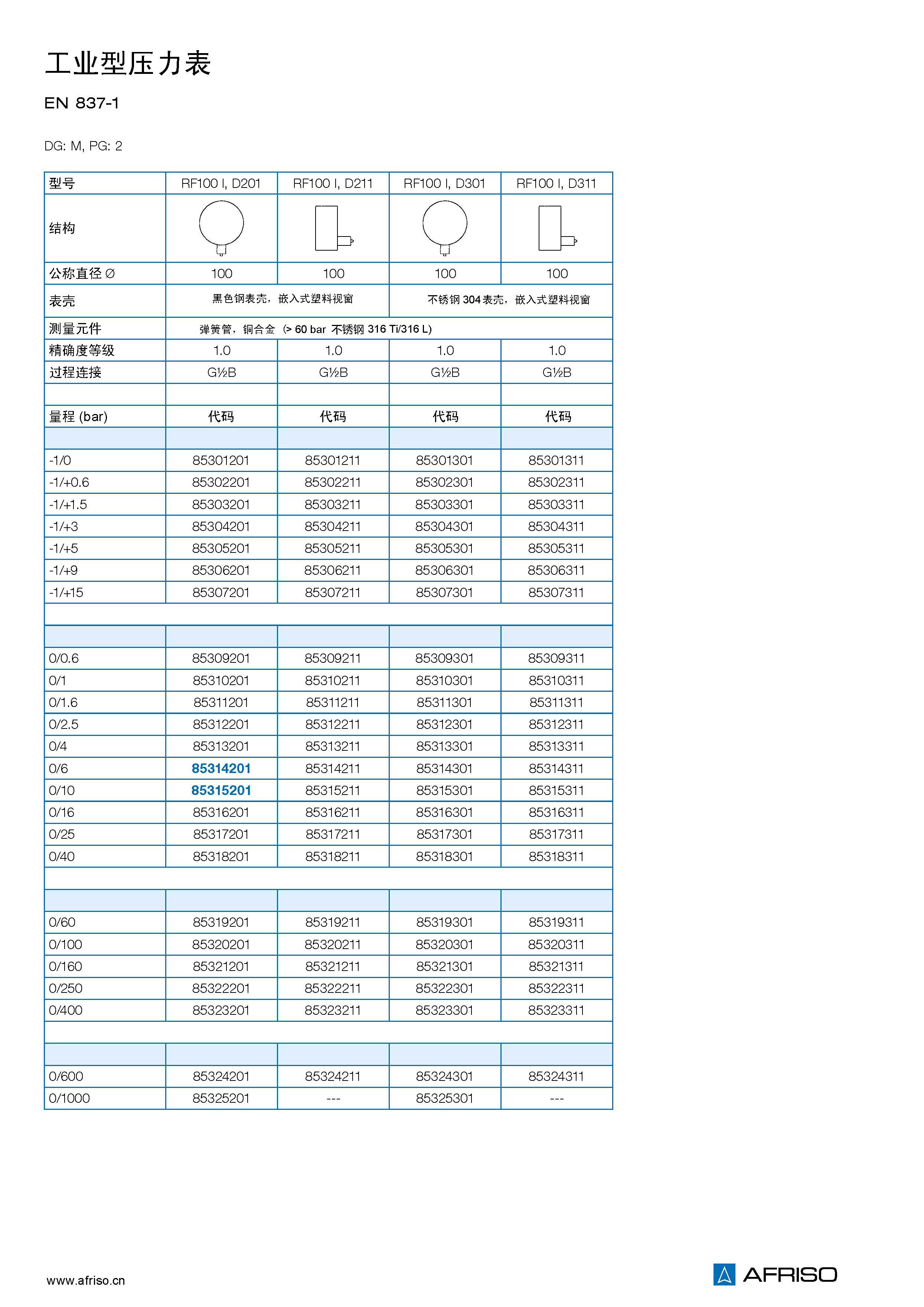 -0.1/0 到 -0.1/+1.5 MPa 0/0.06 到 0/100 MPa |