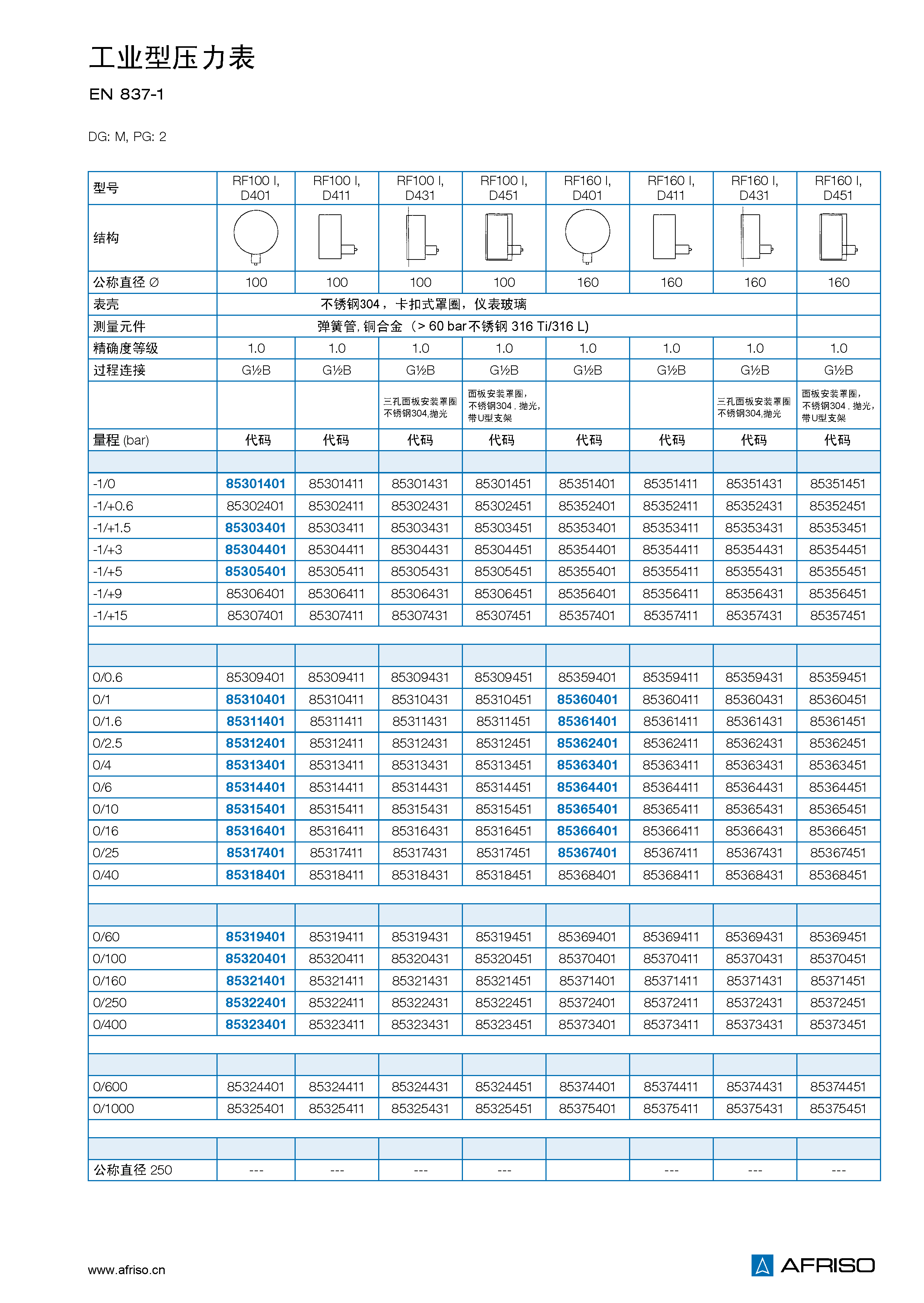 -0.1/0到-0.1/+1.5 MPa 0/0.06到0/100 MPa |