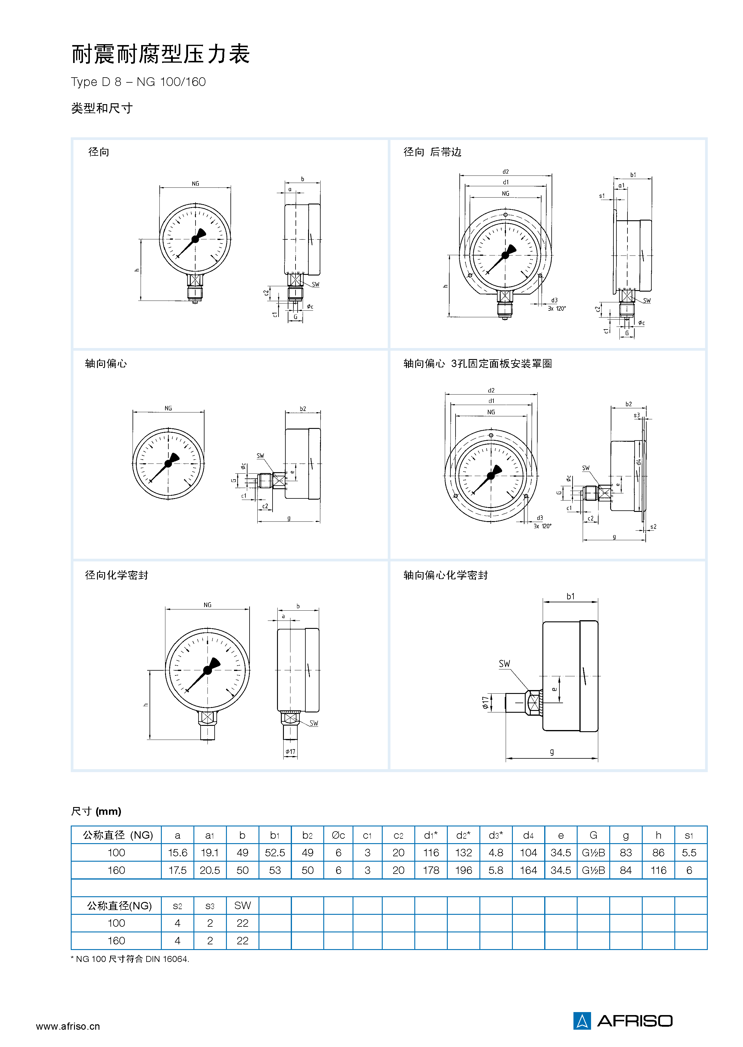 -0.1/0 MPa到-0.1/+1.5 MPa NG 100 0/0.06到0/100 MPa NG 160 0/0.06到0/160 MPa |