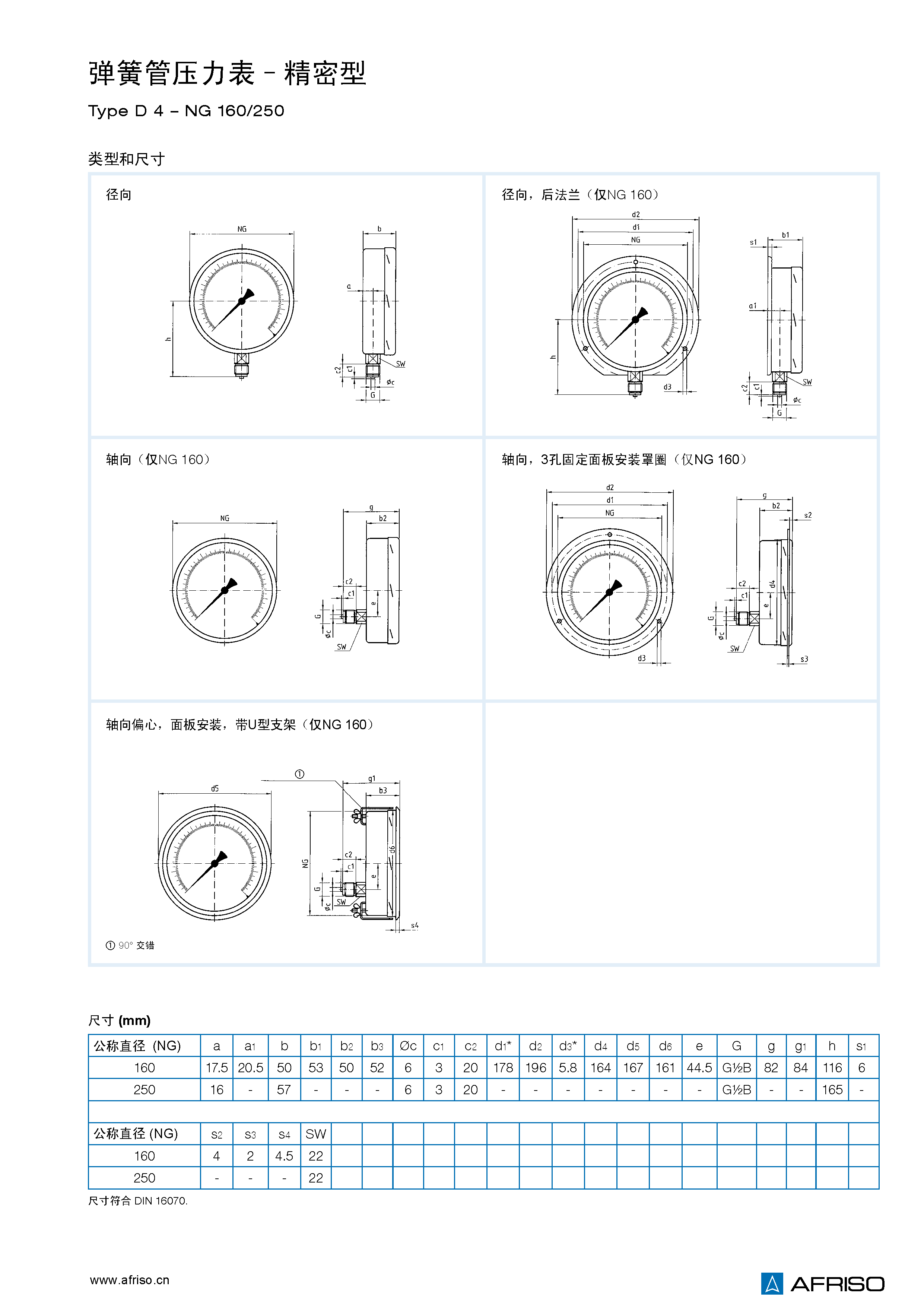 銅合金,徑向或軸向偏心(僅NG160 ) G1/2B– 扳手尺寸SW22( EN 837-1/7.3 ) |