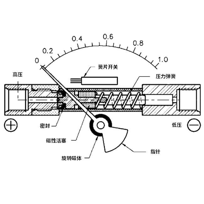 壓力作用在被電磁活塞隔開(kāi)的兩個(gè)壓力腔內(nèi)。如果兩壓力腔的壓力有差異,電磁活塞就會(huì)頂著彈簧產(chǎn)生位移,電磁線(xiàn)圈將這個(gè)位移通過(guò)裝在指針座上的電磁線(xiàn)圈傳遞給指針。壓差直接由指針指示。壓力腔和顯示盤(pán)完全的機(jī)械隔離,排除了泄漏的可能。 |